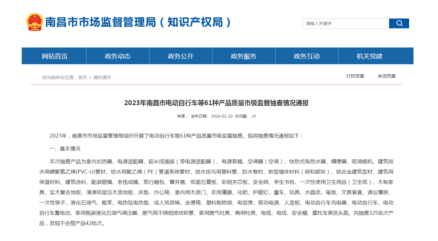 年1月10日正在2024,车等61类产物量量市级抽查传递江西南昌发布2023年南昌市电动自行,次产物不及格抽查发觉1批小型轻便电动三轮车。